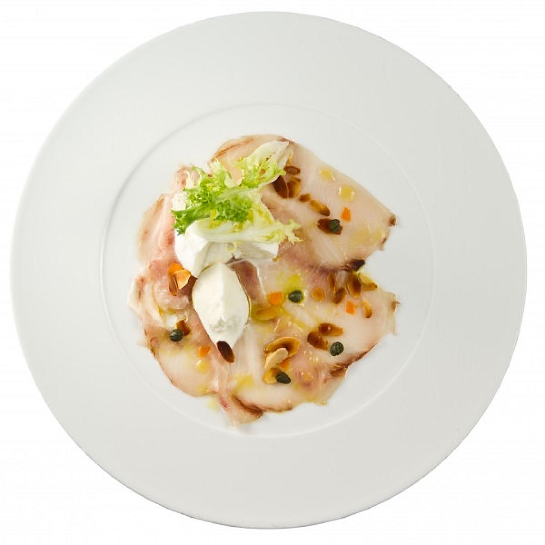 Il carpaccio di pesce spada con mandorle tostate e mozzarella con cuore di panna