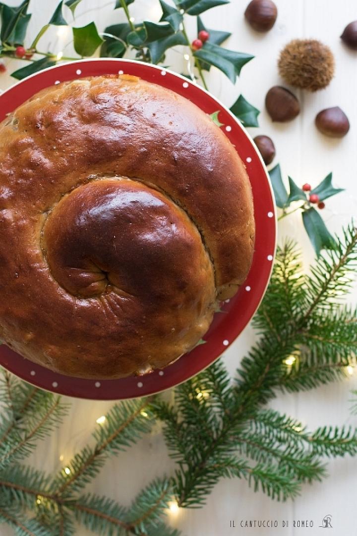 Stendete l'impasto con un mattarello e formate un rettangolo che abbia uno spessore di 5 mm, distribuite i formaggi, lo speck e sbriciolate le castagne sulla superficie della brioche, lasciando libero un margine di circa 3 cm su tutti i 4 lati e spennellateli con un po’ di acqua. Prendete un lato lungo e avvolgetelo su se stesso fino a realizzare un salsicciotto, allungatelo leggermente passando le mani dal centro verso l'esterno e sigillate le estremità. Avvolgete la brioche formando una sorta di spirale e sistematela in uno stampo, precedentemente imburrato, che abbia un diametro di 24 cm. Coprite quest'ultimo con la pellicola e lasciate che la brioche lieviti fino al raddoppio del suo volume.