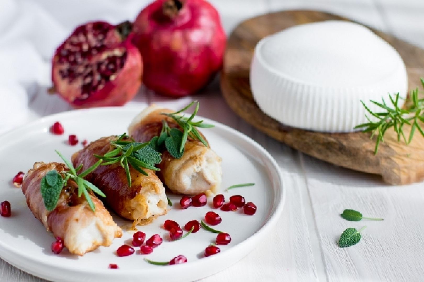 Ponete le fette di pollo tra due fogli di carta forno e con un batticarne assottigliatele leggermente. Salate e pepate le fette e inserite all’interno di ognuna un pezzo di caciostracchino. Portate i due lati più lunghi della fetta verso l’interno e arrotolate una delle due parti corte su se stesso fino ad ottenere un involtino. Disponete sul piano di lavoro due fette di speck, una accanto all’altra, sovrapponendole leggermente e ponete un involtino di pollo all’estremità delle fette di speck avvolgendole intorno. Con uno stecchino chiudete gli involtini e bloccate sulla superficie un rametto di rosmarino e una foglia di salvia.