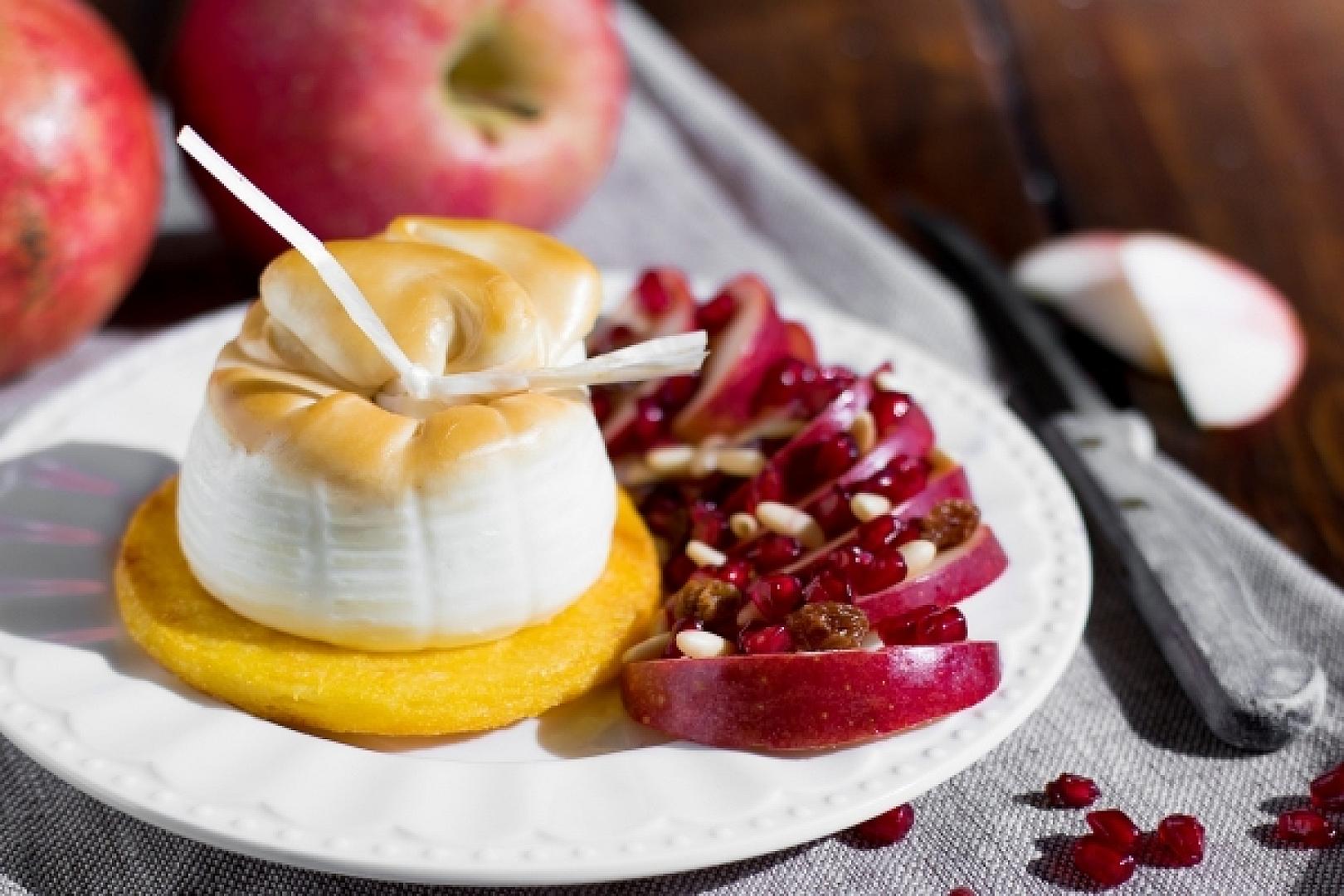 Burratine affumicate con polenta grigliata, insalata di mele, uvetta e melograno