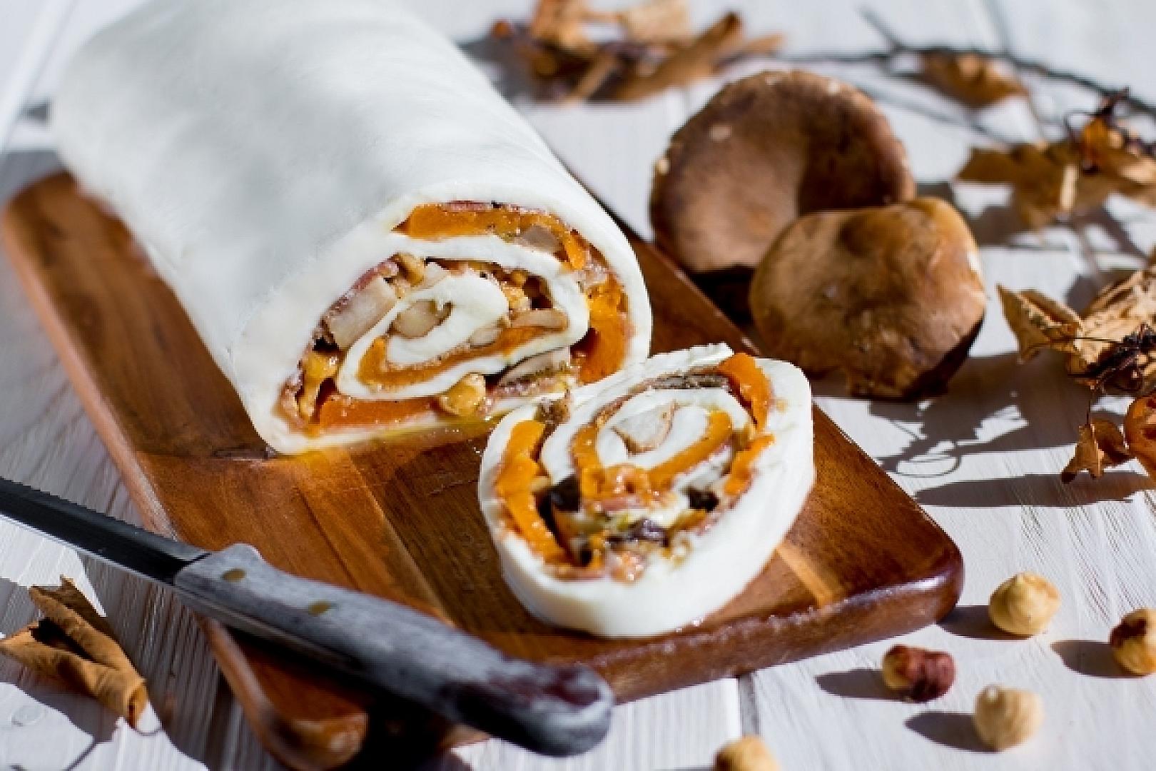 Stendete su un foglio di carta forno la sfoglia di mozzarella, disponete su di essa le fette di finocchiona, stando attenti a lasciare circa 3 cm di margine su tutti i 4 lati della sfoglia. Adagiate sulla finocchiona le fette di zucca, i funghi e le nocciole tritate grossolanamente. Chiudete la sfoglia partendo da uno dei due lati corti, avvolgetelo su se stesso fino ad ottenere un filone con la chiusura verso il basso. Sigillate il prodotto con la pellicola da cucina, sistemate il rotolo su un vassoio e lasciatelo riposare per circa 2 ore in frigorifero. Rifilate l’estremità del rotolo e tagliatelo a fette spesse circa 1,5 cm. Servite
