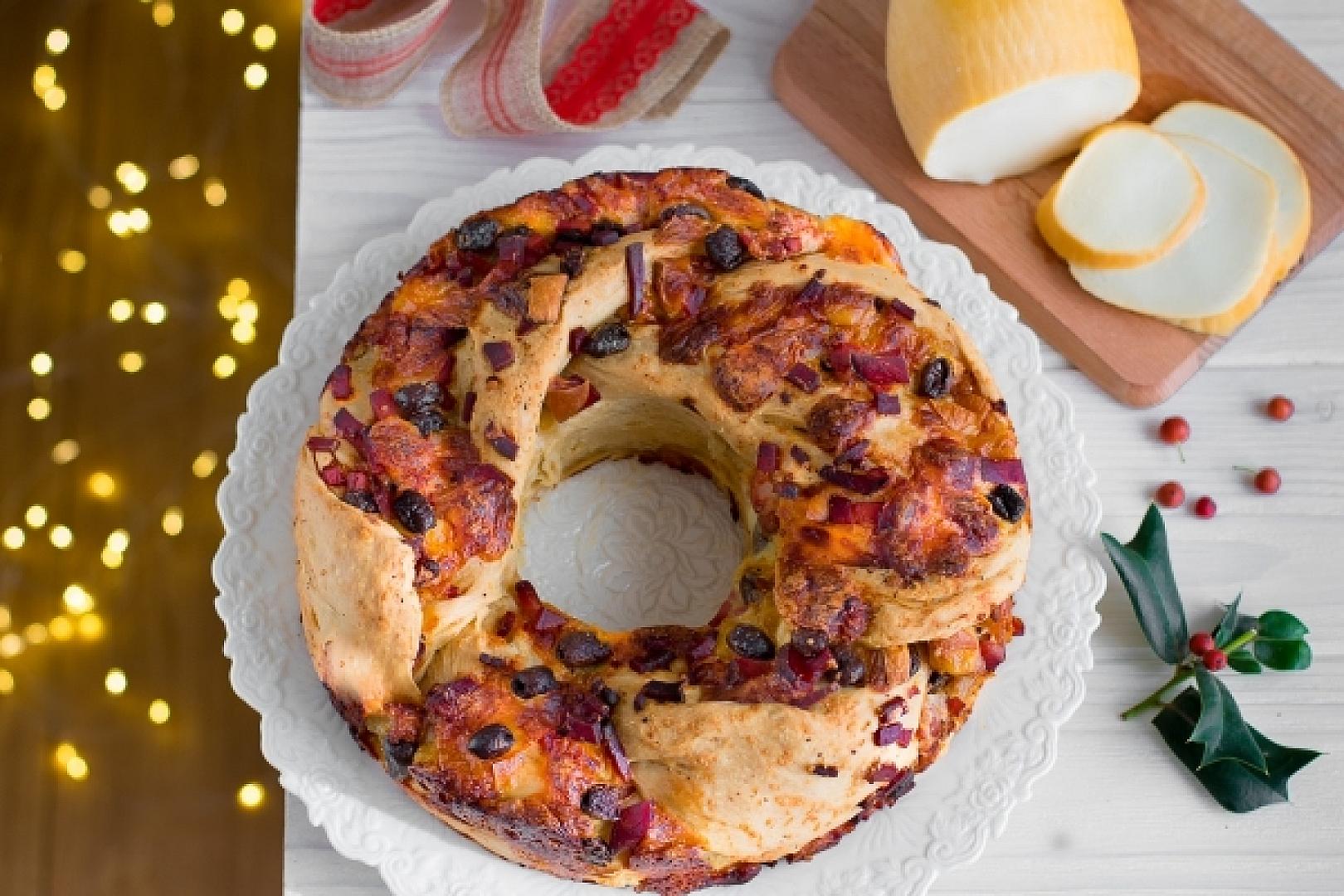 Sgonfiate l’impasto e stendetelo con un mattarello creando un lungo rettangolo che abbia uno spessore di circa 3-4 mm. Distribuite sul rettangolo lo speck, la scamorza, la salsiccia, il parmigiano e le olive.