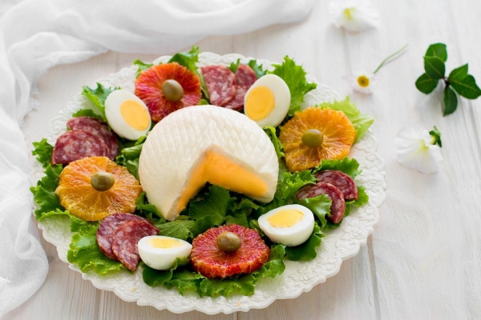 Affettate il salame solo poco prima di servire. Disponete su un piatto da portata delle foglie di insalata, sistemate al centro la pasquella e intorno guarnite con le uova sode, le arance, il salame e le olive alternando tra di loro tutti gli elementi dell’antipasto. Servite.