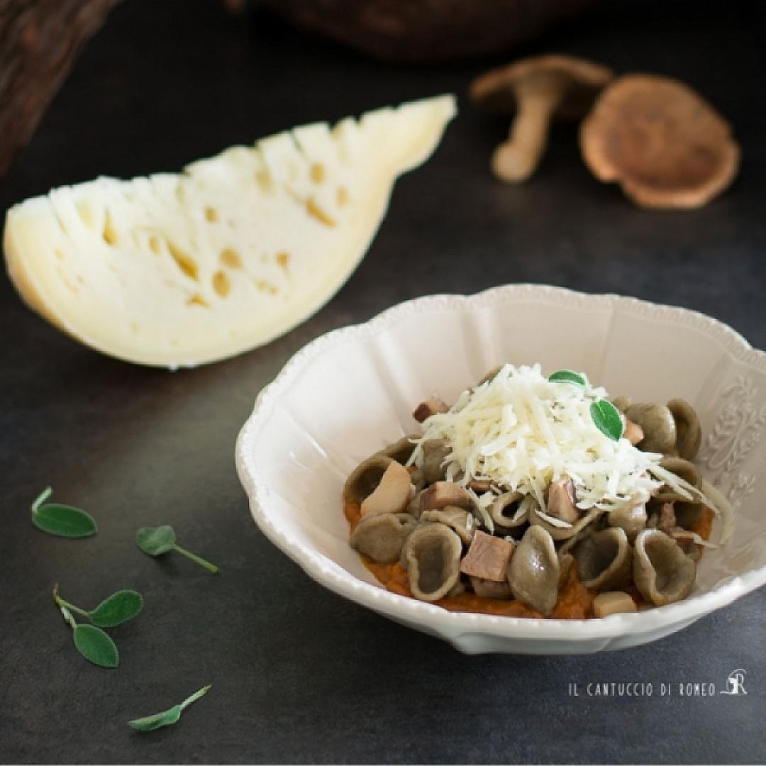 Orecchiette di grano arso con caciocavallo, funghi cardoncelli e purea di zucca alle erbe