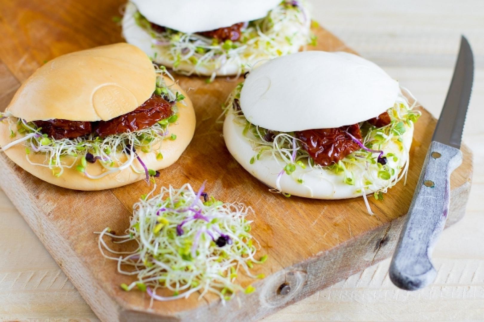 Con un coltello aprite le schiacciatine in due, come se fossero dei panini. Farcitele con un velo di salsa “sud” alla base, una spolverata di granella di pistacchio, 4 pomodori sott’olio ed un ciuffo di germogli di soia. Serviteli disponendoli su un piatto da portata.