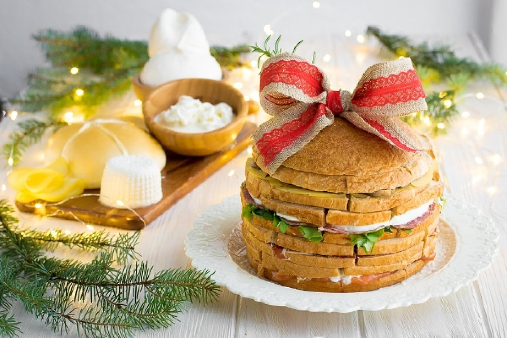 Farcite un disco di pane e sovrapponetene un altro. Aiutandovi con un coltello affilato, dividetelo in 8 spicchi e sistemateli ricomponendo l’intero disco su un piatto da portata. Proseguite così con le altre 4 coppie di fette e fate attenzione a non far combaciare gli spicchi uno sull’altro ma alternateli in modo da dare stabilità all’intera struttura. Terminate con la cupola, ornandola con un rametto di rosmarino.